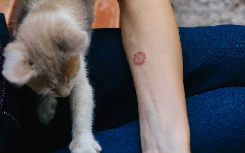 อาการของคนที่ติดเชื้อราแมวมักจะมีผื่นแดงขึ้นตามผิวหนังเป็นวงๆ