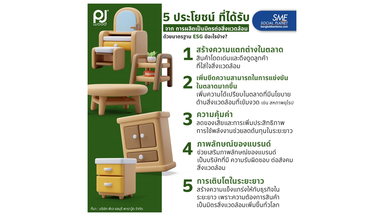 อย่างเช่น บริษัท พีเจ ชลบุรี พาราวู้ด จำกัด ที่มุ่งเน้นแนวทางการผลิตที่เป็นมิตรต่อสิ่งแวดล้อม ได้แก่ การใช้เทคโนโลยีเพื่อเพิ่มประสิทธิภาพการทำงานสูงสุด การใช้ แหล่งพลังงานหมุนเวียน การจัดหาแหล่งวัตถุดิบที่ยั่งยืนและการปกป้องพื้นที่ธรรมชาติและระบบนิเวศ