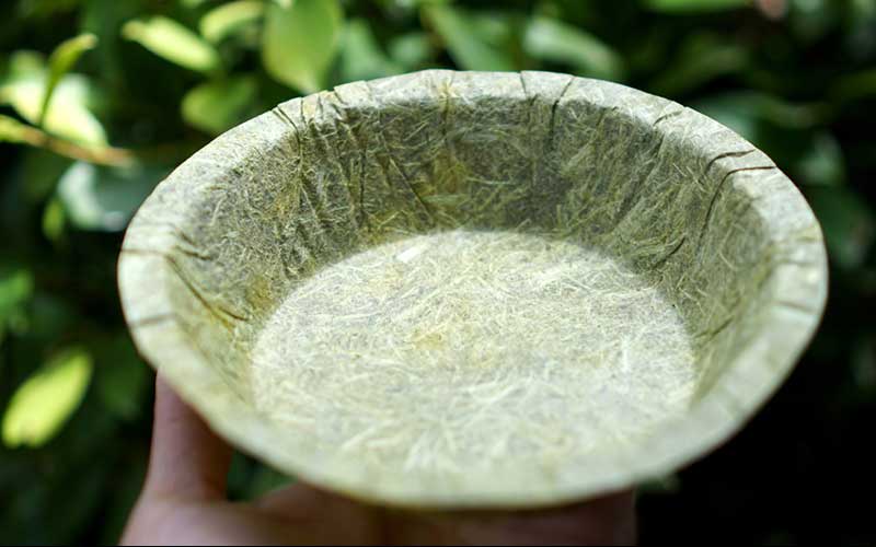 แล้วปิดทับด้วยชั้นใบไม้ด้านบนก่อนปั๊มเข้ารูปทรง มีความแข็งแรงสูงกันน้ำได้ ใช้ระยะเวลาย่อยสลายตามธรรมชาติ