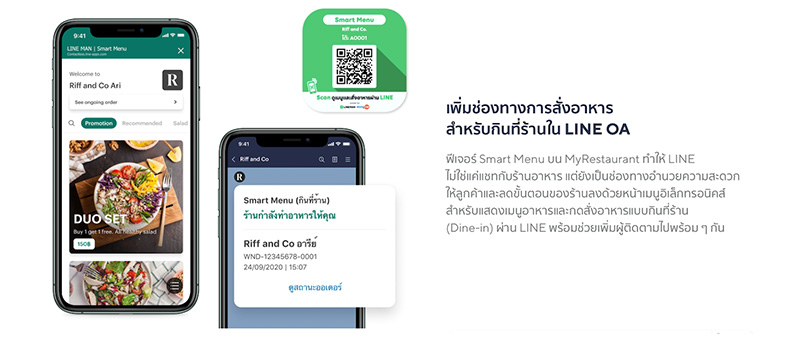 1. เมนูออนไลน์สั่งง่ายด้วย Smart Menu : เมนูอิเล็กทรอนิกส์บน LINE เชื่อมต่อกับระบบรับออเดอร์ของร้านอาหารได้โดยตรง ลูกค้าสามารถสแกน QR Code เพื่อดูเมนูพร้อมกดสั่งอาหารแบบกินที่ร้านผ่าน LINE ได้ทันที สั่งง่าย ไม่ต้องวุ่นวายบอกเบอร์โต๊ะ แถมรวดเร็ว ทันใจ ไม่ต้องกลัวออเดอร์ผิดพลาด รับนโยบาย contactless ไปด้วยในตัว