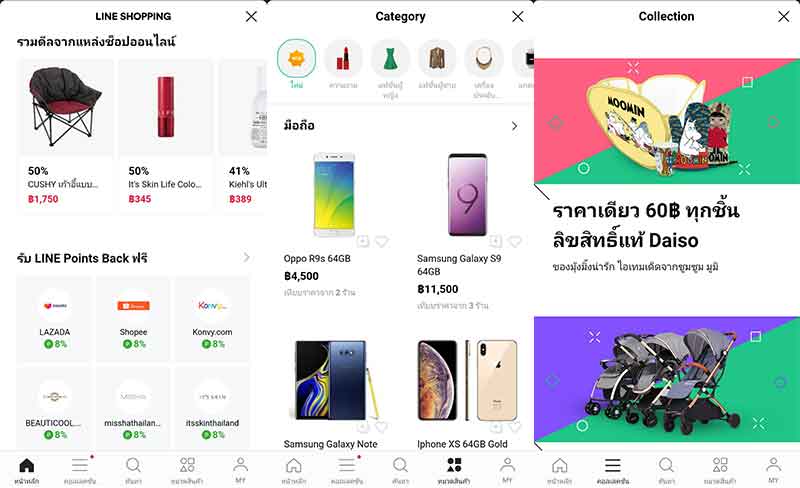 - เปิด LINE เข้า Wallet แล้วกด LINE SHOPPING ก็สามารถเลือกซื้อสินค้าหลากหลายประเภททั้งกลุ่มสินค้าแฟชั่น