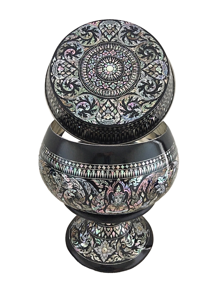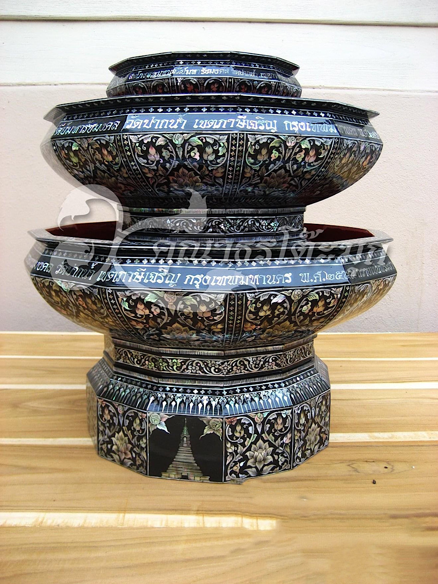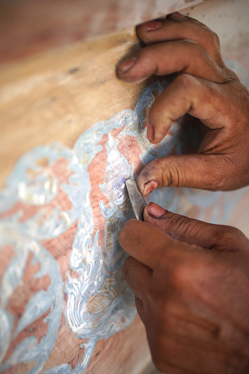 การประดับมุกลงหุ่น หรือวัสดุพื้นผิวไม้ที่ย้อมสี เริ่มจากร่างลายบนพื้นผิวและแกะสลักให้เป็นลายตื้นเพื่อให้สามารถฝังชิ้นเปลือกมุก โดยใช้เปลือกหอยได้หลายชนิด เช่น หอยมุก หอยอูฐ หอยนมสาว หอยเป่าฮื้อ หอยจอบ มาขัดให้เป็นประกายมันวาวเป็นสีรุ้ง ศัพท์ทางช่างเรียกว่า ‘มุกไฟ’ ส่องประกายวาวแม้ต้องแสงธรรมชาติ