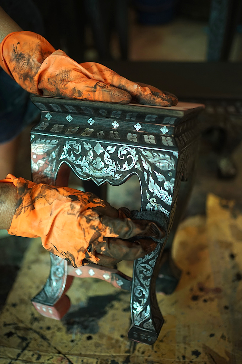 หลังจากฝังมุกตามร่องลายที่ออกแบบไว้เสร็จ จะถมพื้นวัสดุและปิดเสี้ยนไม้ด้วยยางรัก (นำเข้าจากต่างประเทศ) ให้เต็มพื้นผิว แล้วขัดจนกระทั่งลายมุกปรากฏขึ้นมาเรียบเสมอกับผิวไม้ จะเห็นได้ว่างานประดับมุกเป็นงานละเอียด ต้องอาศัยช่างฝีมือที่มีความชำนาญสูง และมีความอดทนเป็นอย่างมาก เพราะเป็นงานทำมือ 100% ที่ใช้เวลาการผลิตนานกว่า 1-2 เดือนต่อชิ้น