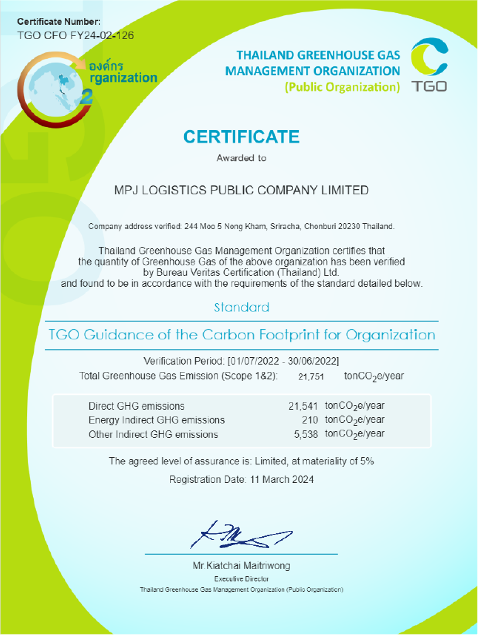 ประเด็นนี้ คุณไพรัต ภูฆัง ประธานเจ้าหน้าที่บริหารฝ่ายบัญชีและการเงิน (CFO) บริษัท เอ็ม พี เจ โลจิสติกส์ จำกัด (มหาชน) อธิบายว่า เราให้ความสำคัญกับนโยบาย ESG มุ่งมั่นลดผลกระทบต่อสิ่งแวดล้อม โดยบริษัท ได้ว่าจ้างที่ปรึกษาและบริษัทที่มีการรับรองในการคำนวณการปล่อยก๊าซเรือนกระจกและทางบริษัทได้รับการรับรองมาตรฐาน ISO 14064-1: 2018 รวมถึงจัดทำคาร์บอนฟุตพริ้นท์ขององค์กร (Carbon Footprint for Organization: CFO) ตามมาตราฐานขององค์การบริหารจัดการก๊าซเรือนกระจก (องค์การมหาชน) พร้อมทั้งได้กำหนดนโยบาย “ลดการใช้พลังงานและการอนุรักษ์สิ่งแวดล้อม” ซึ่งเป็นกรอบในการปฏิบัติงานที่คณะกรรมการบริษัท ผู้บริหาร และพนักงานทุกคนต้องยึดถือและปฏิบัติ