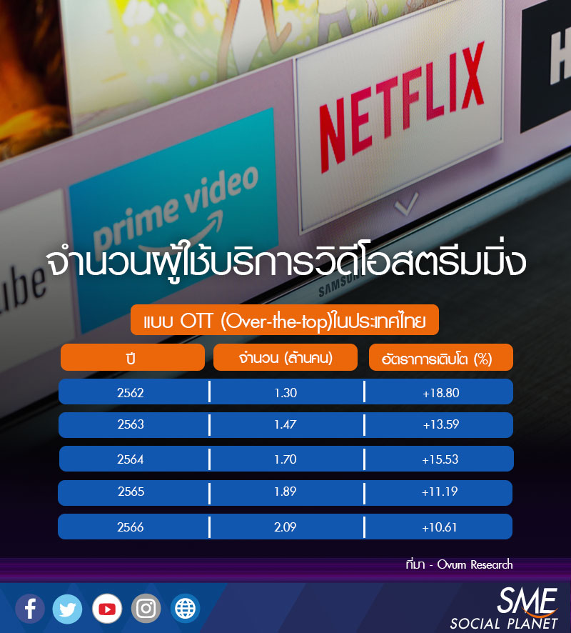 จากรายงานวิเคราะห์ตลาด VDO Streaming แบบ Over-the-Top TV ( OTT) หรือสื่อที่เผยแพร่เนื้อหาข้อมูลในรูปแบบข้อความ ภาพ หรือเสียงผ่านโครงข่ายอินเทอร์เน็ต ของสำนักนโยบายและวิชาการกระจายเสียงและโทรทัศน์ (วส.) สำนักงาน กสทช. และข้อมูลการวิจัยล่าสุดของ Ovum บริษัทจัดเก็บวิเคราะห์ข้อมูลและที่ปรึกษาด้านโทรคมนาคมและเทคโนโลยีจากประเทศอังกฤษ ได้สำรวจตลาดผู้ใช้บริการ OTT แบบลงทะเบียนเป็นสมาชิกในไทย โดยประมาณการณ์ว่าในปี 2562 มียอดผู้ใช้บริการประมาณ 1.3 ล้านรายเพิ่มขึ้น 18.80% จากปี 2561 ที่มียอดผู้ชมรวม 1.09 ล้านรายและจะเพิ่มขึ้นเป็น 2.1 ล้านรายในช่วง 5 ปีหรือในปี 2566