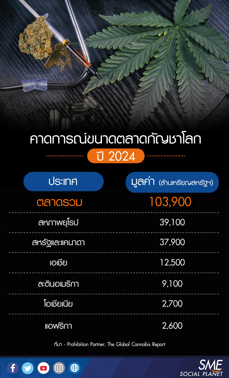 ข้อมูลจาก Prohibition Partner ออกรายงานด้านกัญชาโลก หรือ The Global Cannabis Report ระบุว่า แนวโน้มมูลค่าตลาดกัญชาทั่วโลกจะสูงถึง 103,900 ล้านเหรียญสหรัฐ ในอีก 5 ปีข้างหน้าหรือในปี 2567