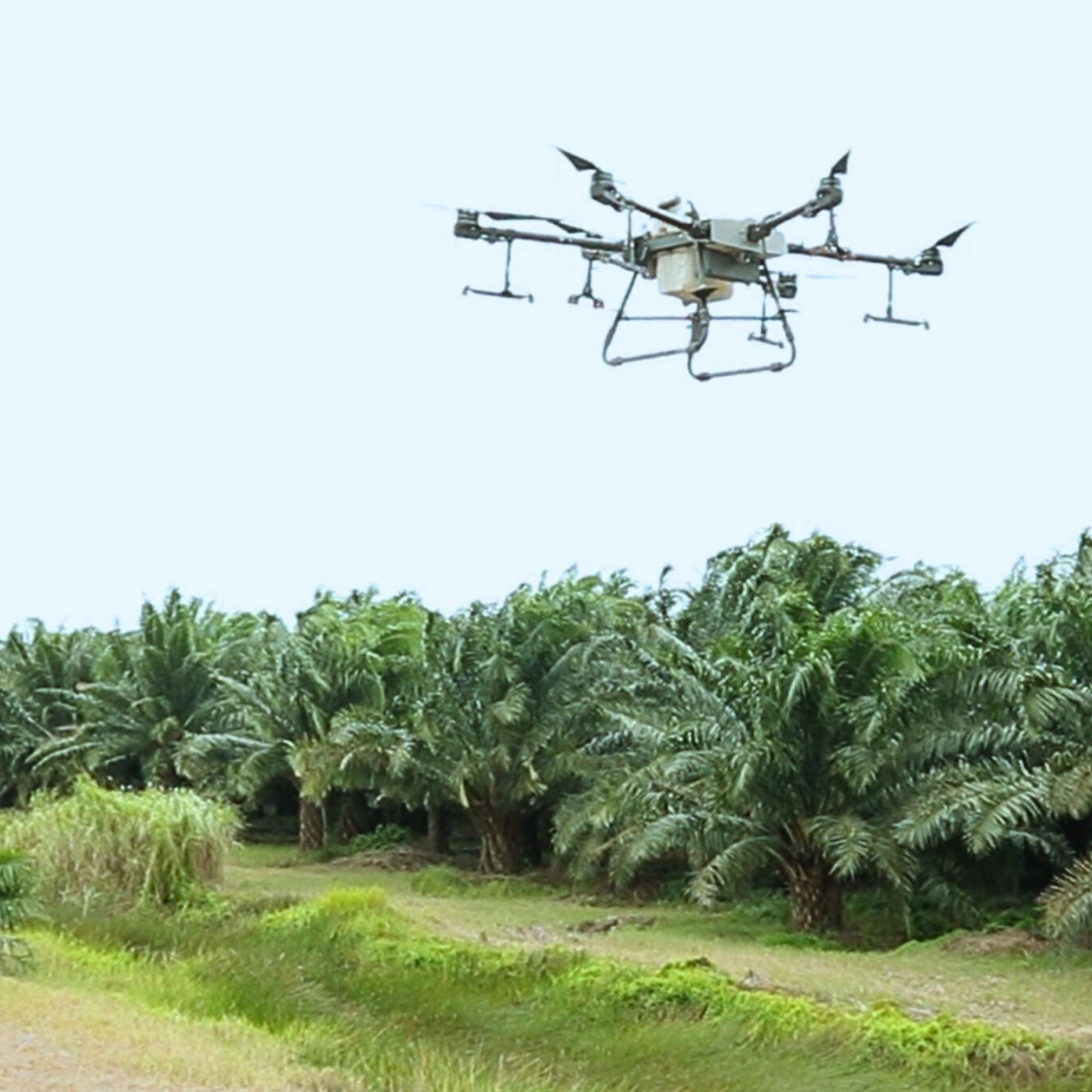 การปลูกปาล์มน้ำมันแบบเดิม มักประสบปัญหาเรื่องโรคและแมลง ก่อนหน้านี้ต้องใช้แรงงานคนในการฉีดยาฆ่าแมลง โดยเฉพาะเมื่อมีการระบาดของหนอน ที่มีการระบาดรวดเร็วและการทำลายรุนแรง ซึ่งการใช้แรงงานคน ทำได้ช้า และควบคุมการระบาดได้ไม่ดี ปัจจุบัน เราเริ่มนำโดรนเข้ามาใช้ในการฉีดพ่น ทำให้การจัดการรวดเร็วและมีประสิทธิภาพมากขึ้น นอกจากนี้ เรายังนำเครื่องหว่านปุ๋ยเข้ามาใช้เพื่อให้กระบวนการใส่ปุ๋ยทำได้เร็วขึ้น