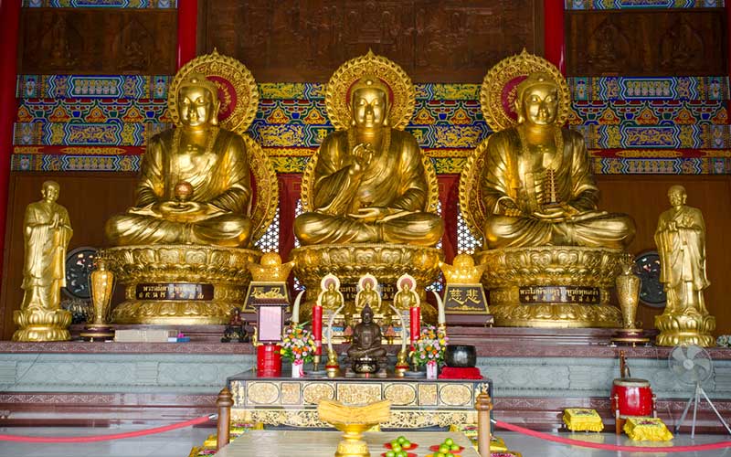 องค์ซ้ายคือ “พระอมิตาภพุทธเจ้า” พระธยานิพุทธเจ้าผู้สถิตอยู่ในดินแดนสุขาวดี หรือแดนสวรรค์ที่ไม่มีความทุกข์ ถ้าใครอยากไปเกิดในดินแดนนี้ให้ภาวนาถึงพระองค์ท่าน และองค์ขวาคือ “พระไภษัชยคุรุพุทธเจ้า” หรือ “เอี่ยซือหุก” เป็นพระพุทธเจ้าแห่งการแพทย์ ท่านใดเจ็บป่วยหรือมีคนในครอบครัวที่เจ็บป่วยมาขอพรต่อท่านได้ หรือมาขอพรเพื่อให้ได้เจอแพทย์เก่งๆ มารักษาโรคที่เป็นอยู่ก็ได้