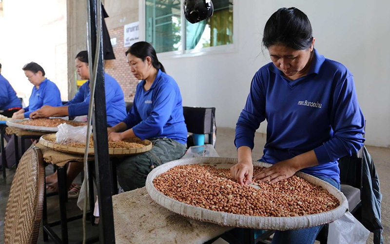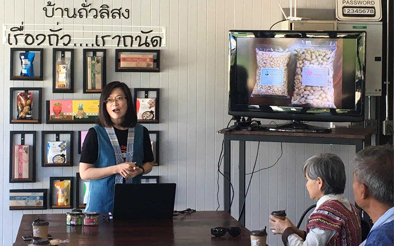 คุณอารีย์ เล่าว่า บ้านถั่วลิสงเป็นโรงงานถั่วลิสงแห่งเดียวของน่าน ที่มีวัตถุดิบมาจากเกษตรกรประมาณ 1,000 กว่าครัวเรือน โดยพยายามผลักดันสร้างชุมชนเกษตรกรให้เข้มแข็ง ด้วยการทำเกษตรพันธสัญญา(Contract Farming)