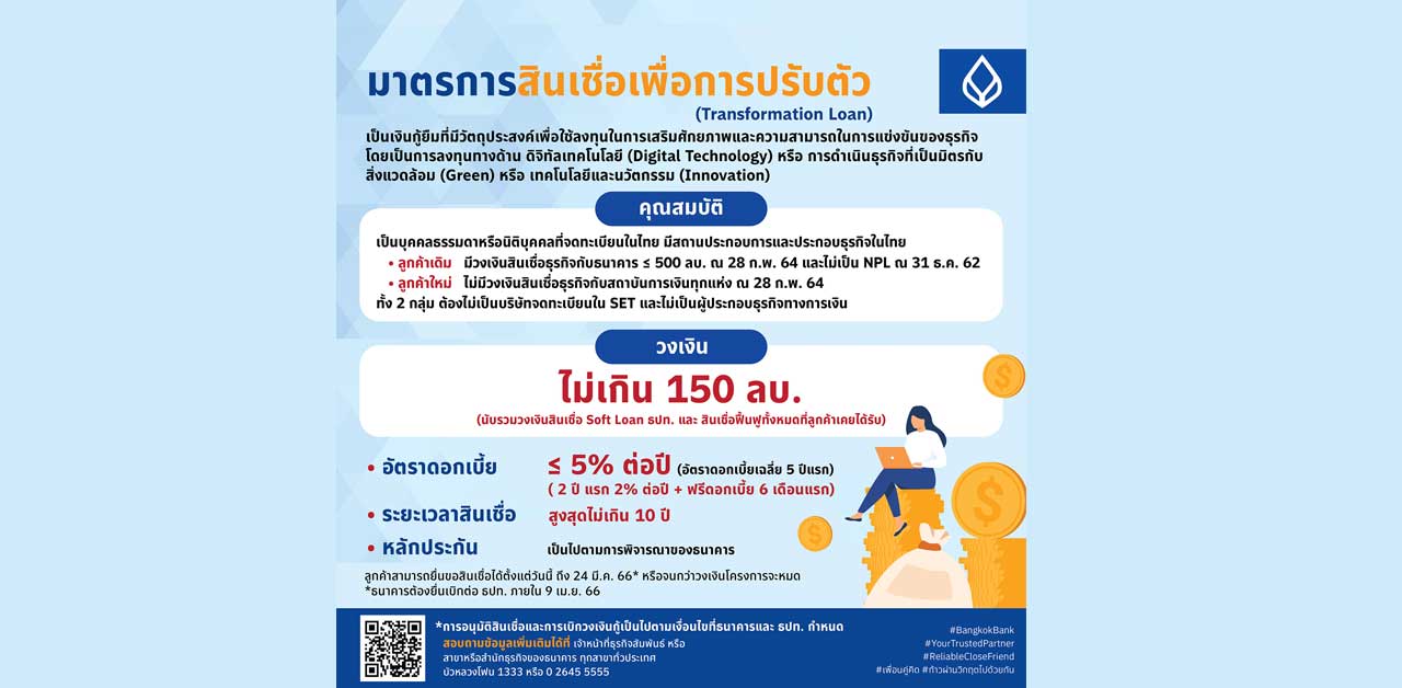 ทั้งนี้หากลูกค้าท่านใดสนใจเข้าร่วมมาตรการให้ความช่วยเหลือ สามารถติดต่อขอรับความช่วยเหลือได้ที่เจ้าหน้าที่ธุรกิจสัมพันธ์ที่ดูแลสินเชื่อของท่าน สาขาหรือสำนักธุรกิจทั่วประเทศของธนาคาร และบัวหลวงโฟน โทร.1333 หรือ 0-2645-5555