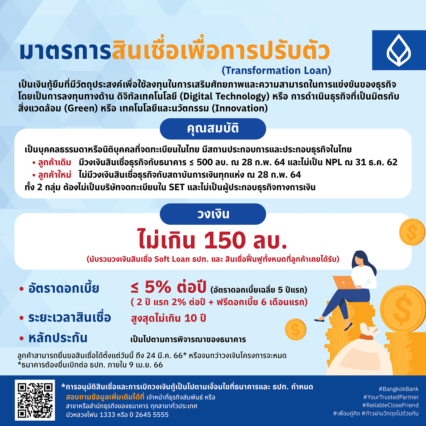 โดยธนาคารขอสงวนสิทธิ ในการพิจารณาสินเชื่อและหลักประกันตามหลักเกณฑ์ เงื่อนไข และระเบียบปฏิบัติของธนาคาร นอกจากนี้ หากลูกค้าไม่เข้าเกณฑ์คุณสมบัติได้รับสินเชื่อเพื่อการปรับตัว ธนาคารก็มีมาตรการสนับสนุนสินเชื่อเพิ่มเติมอื่นๆ เพื่อช่วยเหลือลูกค้าในการปรับตัวด้วยเช่นกัน