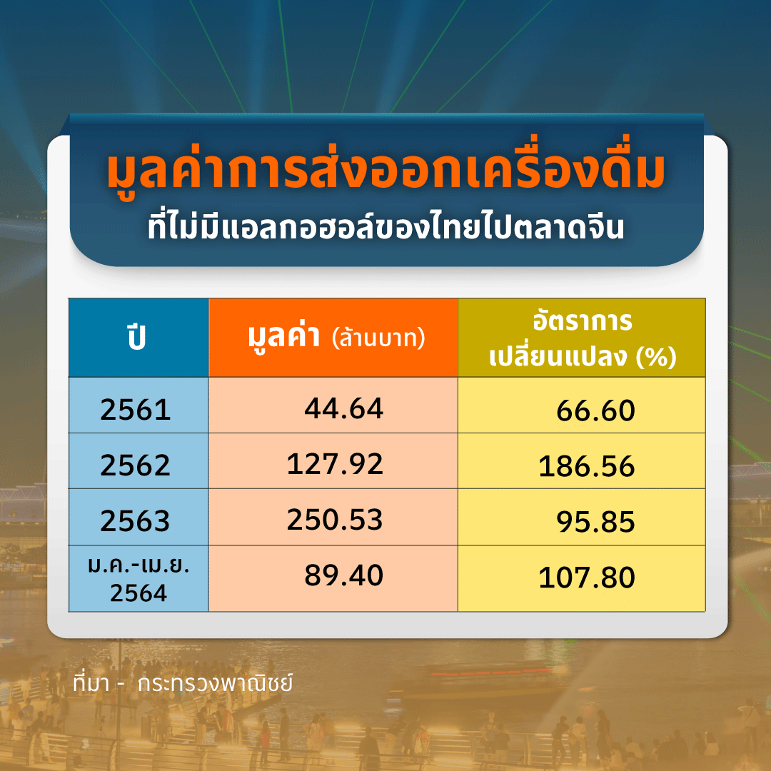 โดยที่ผ่านมาจีนถือเป็นตลาดส่งออกเครื่องดื่มที่ไม่มีแอลกอฮอล์เบอร์ 2 ของไทย รองจากตลาดกัมพูชา
