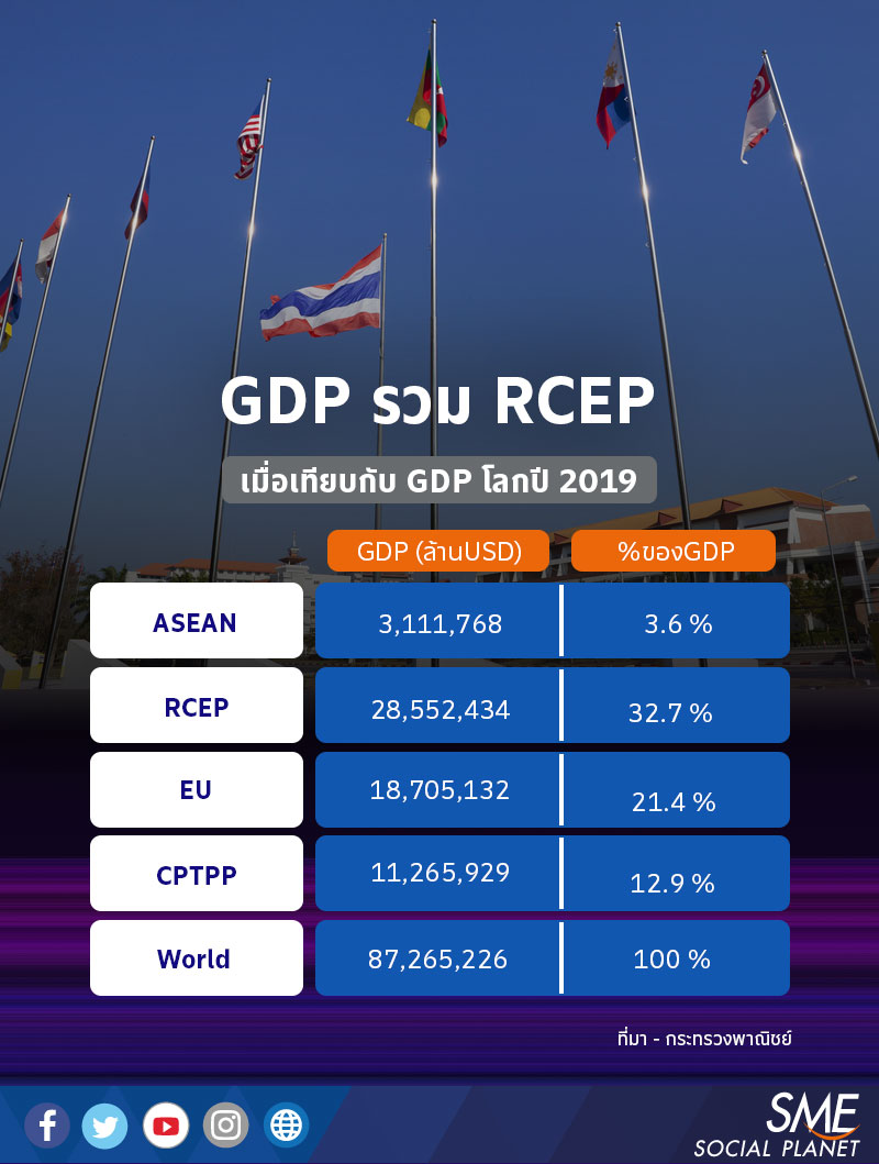 ประเทศไทยนับเป็น 1 ใน 15 ชาติที่ได้ลงนามความตกลงหุ้นส่วนทางเศรษฐกิจระดับภูมิภาค (Regional Comprehensive Economic Partnership) หรือ RCEP ที่กลายเป็นเวทีการค้าที่ใหญ่ที่สุดในโลก เมื่อวันที่ 15 พฤศจิกายน 2563 สำหรับประเทศพันธมิตร RCEP ดังกล่าว ประกอบด้วย  บรูไน กัมพูชา อินโดนีเซียน ลาว มาเลเซีย เมียนมา ฟิลิปปินส์ สิงคโปร์ ไทย เวียดนาม จีน ญี่ปุ่น เกาหลีใต้ ออสเตรเลีย นิวซีแลนด์  โดยมีผลผลิตมวลรวมภายในประเทศ (จีดีพี) รวมกันแล้วมูลค่าสูงถึง 91.98 ล้านล้านดอลลาร์สหรัฐ หรือ 30 % ของจีดีพีโลก