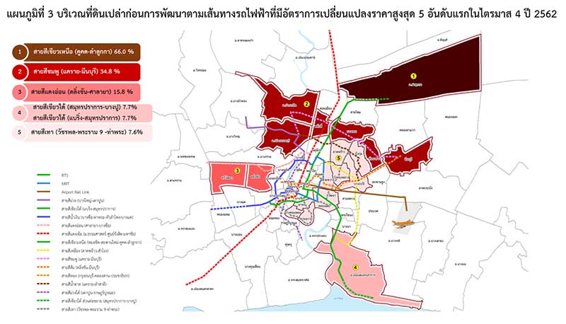มีอัตราการเปลี่ยนแปลงของราคาเพิ่มขึ้นร้อยละ 34.8 ซึ่งเป็นเส้นทางรถไฟฟ้าที่อยู่ระหว่างการก่อสร้าง