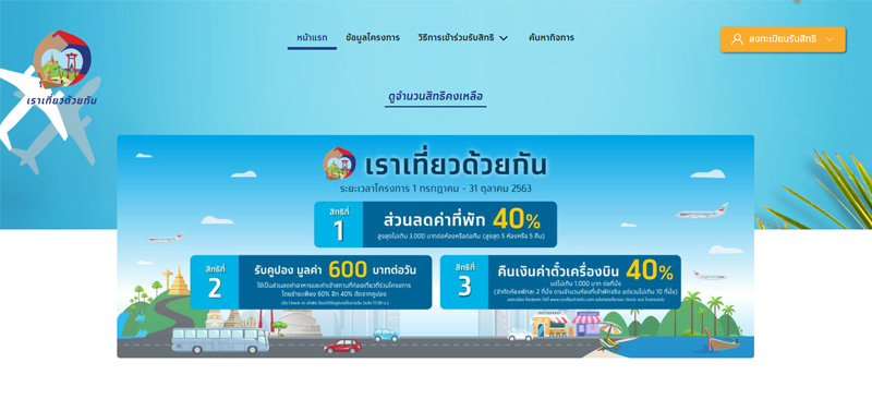 “เราเที่ยวด้วยกัน” ได้เปิดให้ประชาชนเข้าไปลงทะเบียนในเว็บ www.เราเที่ยวด้วยกัน.com ซึ่งเป็นมาตรการกระตุ้นเศรษฐกิจเข้าถึงธุรกิจการท่องเที่ยวโดยตรง