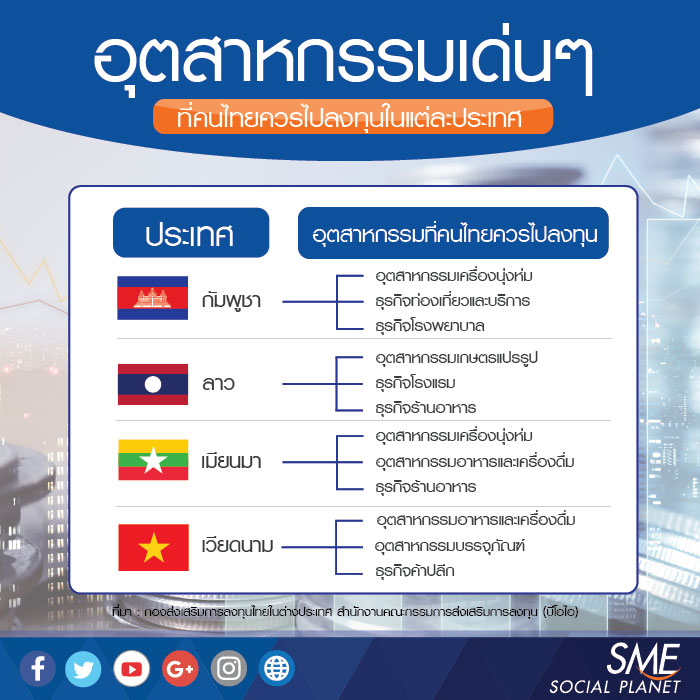 ที่คนไทยควรเข้าไปลงทุนในแต่ละประเทศ ได้แก่ กัมพูชา อุตสาหกรรมเด่น คือ