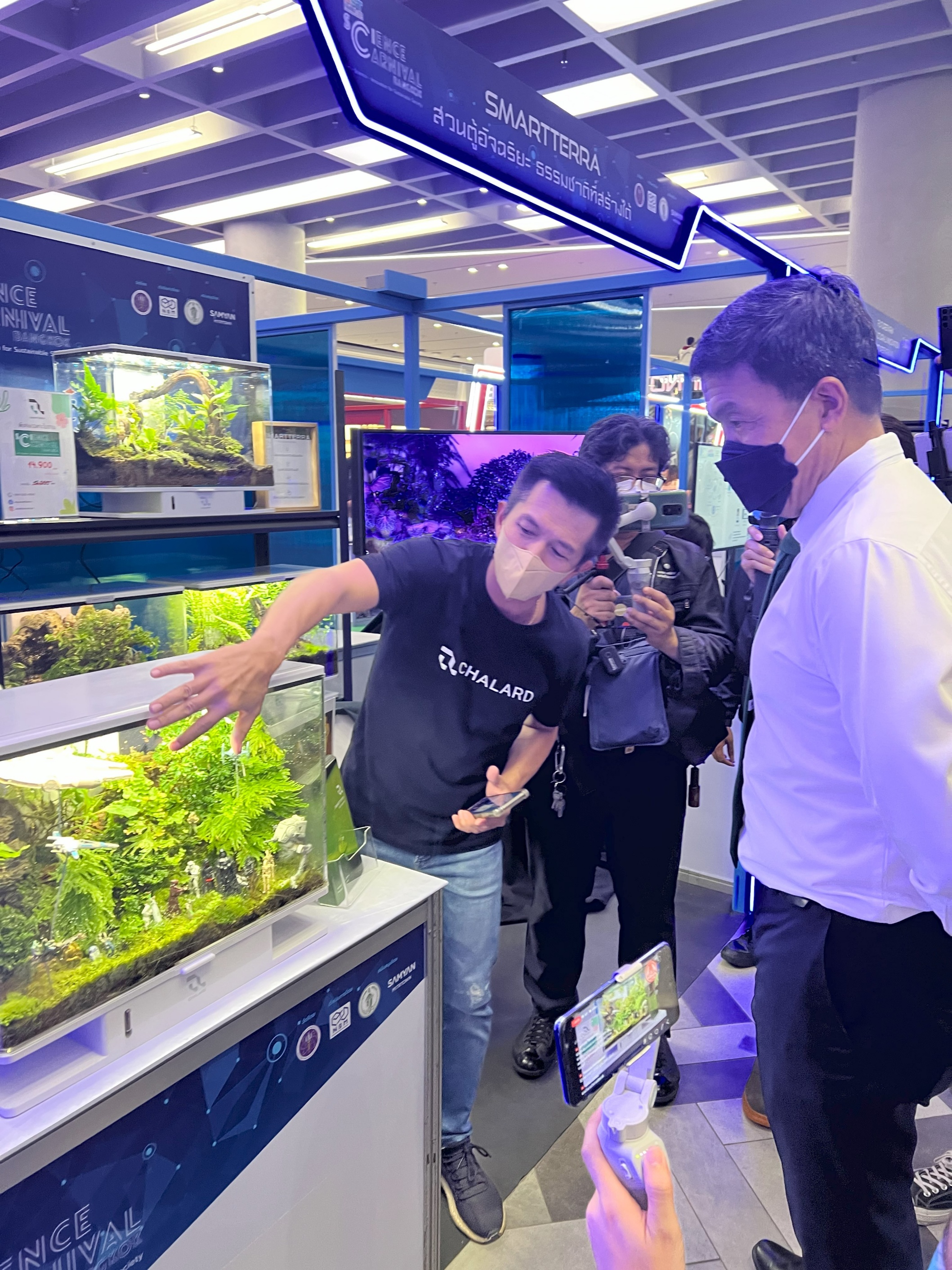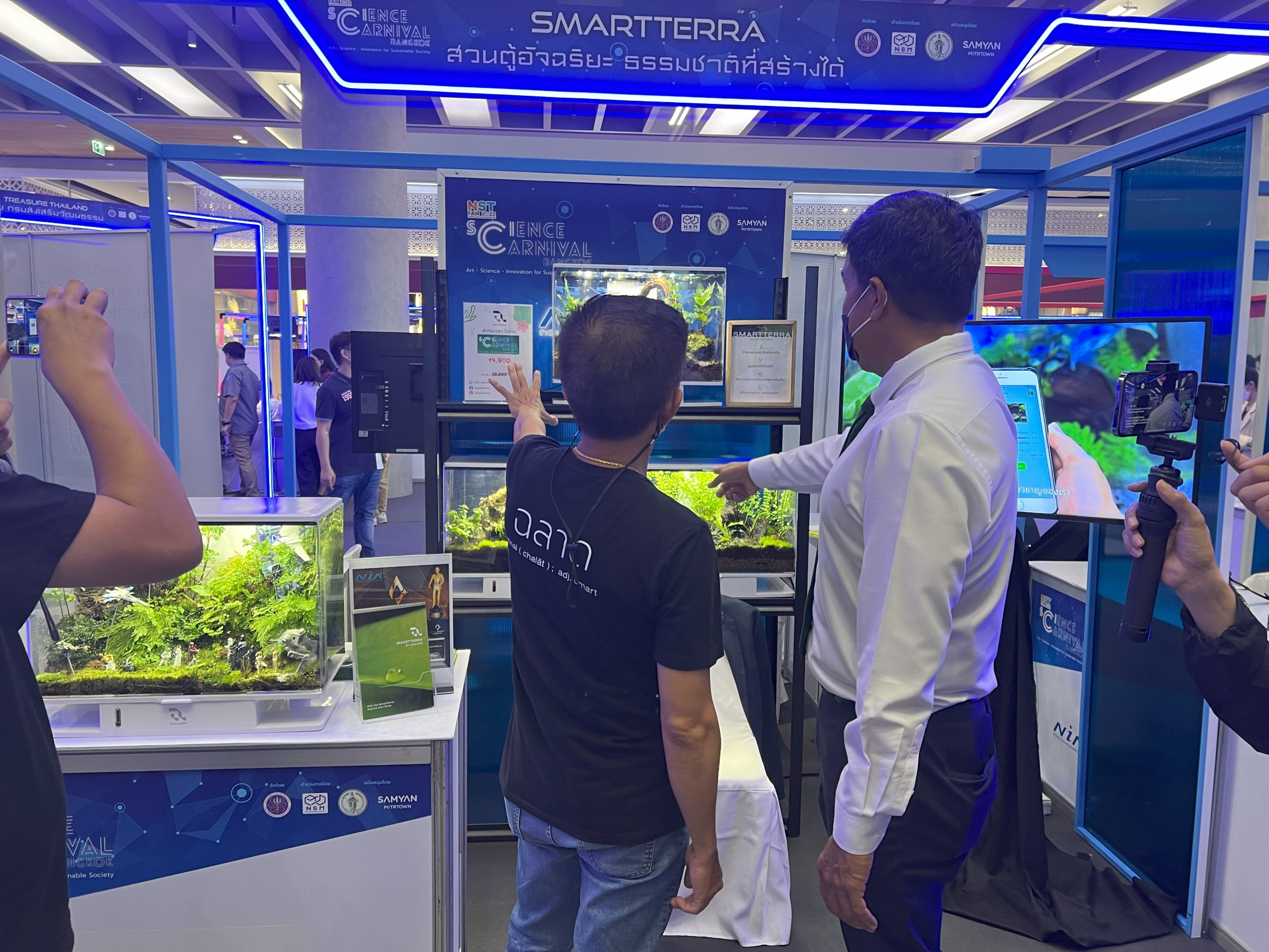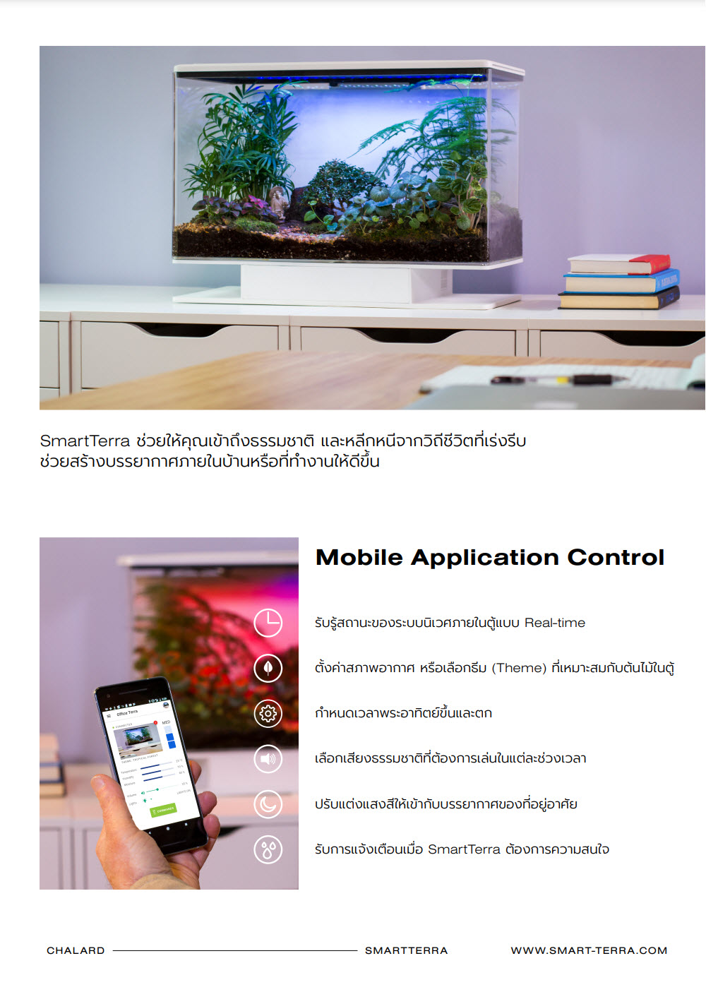 ‘SMARTTERRA’ นอกจากจะมี Software หลัก คือระบบ Water cycle หรือ ระบบน้ำหมุนเวียน ด้านล่างจะมีแท็งก์น้ำ สำหรับให้ฝนที่ตกลงมาไหลกลับมาที่แทงค์ และวนไหลกลับมาใช้ใหม่ ความถี่ของการเติมน้ำจึงทำแค่เดือนละครั้ง สอง เรามีระบบลมหมุนเวียน ทำให้เกิดการระบายภายใน ลมในตู้จะดูดอากาศจากภายนอกเข้าไปทำให้ตู้ใสไม่เกิดฝ้า มองเห็นทัศนียภาพที่เราตกแต่งไว้ภายใน หากตู้มีความชื้นมากเกินไปจะเกิดเชื้อรา เพราะฉะนั้นจึงต้องมีลมที่ไล่ความชื้น รวมทั้งตู้ของเรา จะสร้างออกซิเจนเมื่อนำไปวางภายในบ้านเช่น ห้องนอน หรือห้องนั่งเล่น เป็นเหมือนตัวกรองอากาศขนาดย่อม สร้างความสดชื่น