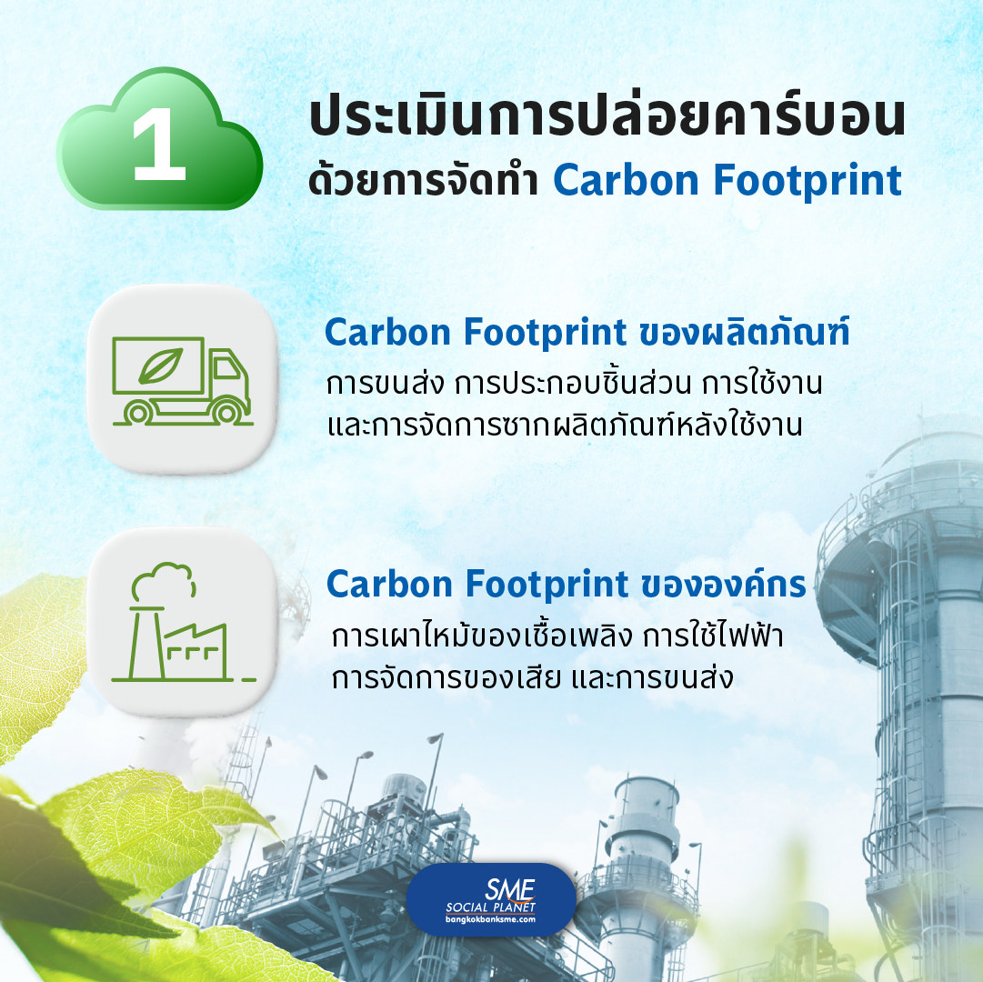 อันดับแรก ผู้ประกอบการจำเป็นต้องรู้ก่อนว่า ธุรกิจของตนมีการปล่อยคาร์บอนเป็นปริมาณเท่าไหร่หรือที่เรียกว่าการทำ Carbon Footprint ซึ่งมีทั้งการทำ Carbon Footprint ของผลิตภัณฑ์ หมายถึงปริมาณคาร์บอนที่ปล่อยออกมาจากผลิตภัณฑ์แต่ละหน่วยตั้งแต่การได้มาซึ่งวัตถุดิบ การขนส่ง การประกอบชิ้นส่วน การใช้งาน และการจัดการซากผลิตภัณฑ์หลังใช้งาน โดยคำนวณออกมาในรูปของตันคาร์บอนไดออกไซด์ และ Carbon Footprint ขององค์กร หมายถึงปริมาณคาร์บอนที่ปล่อยออกมาจากกิจกรรมต่างๆ ขององค์กร เช่น การเผาไหม้ของเชื้อเพลิง การใช้ไฟฟ้า การจัดการของเสีย และการขนส่ง โดยวัดออกมาในรูปตันคาร์บอนไดออกไซด์เช่นเดียวกัน