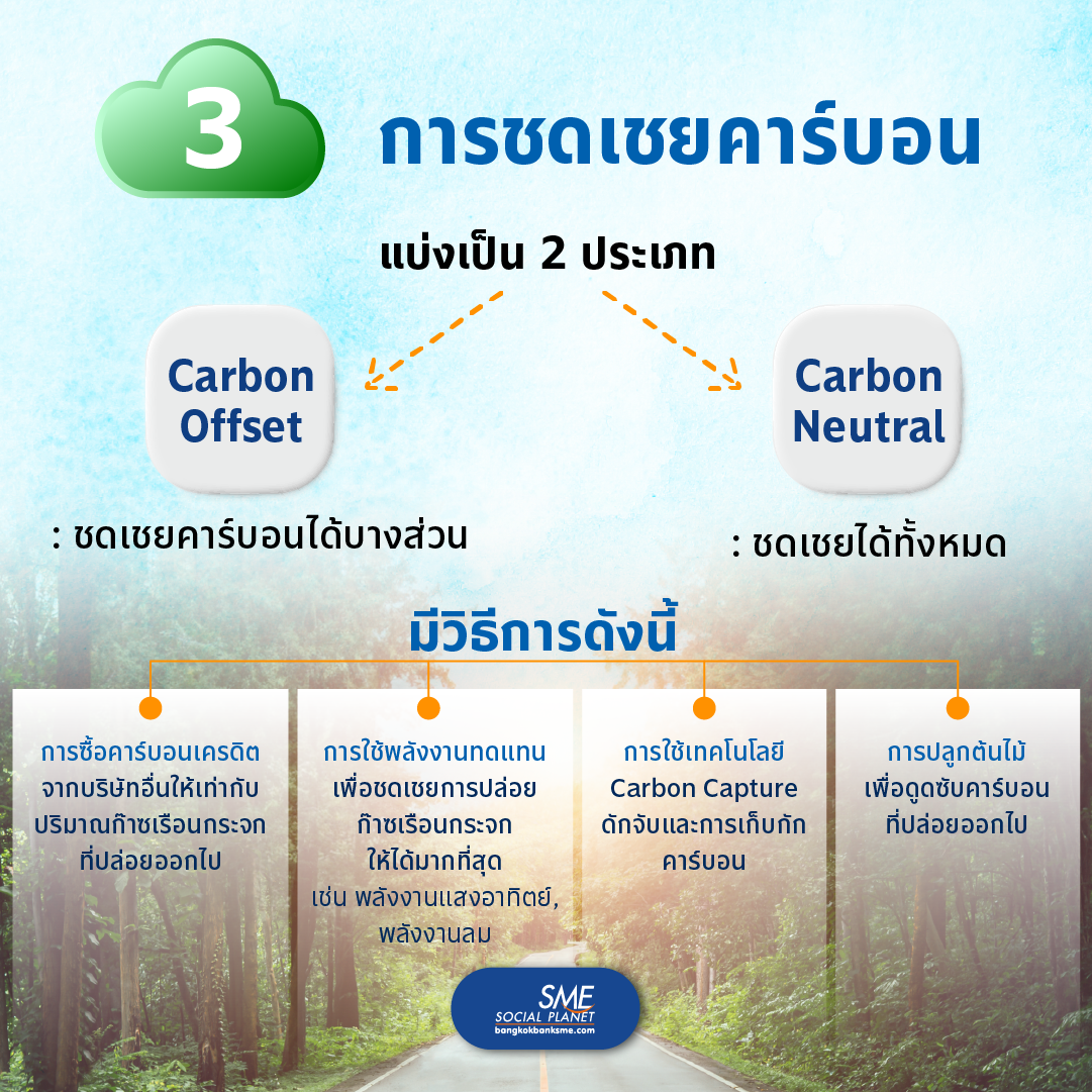 สำหรับธุรกิจที่ไม่สามารถลดการปล่อยคาร์บอนได้ทั้งหมด ต้องชดเชยคาร์บอนด้วยการซื้อคาร์บอนเครดิต โดยในกรณีที่สามารถชดเชยคาร์บอนได้บางส่วนและยังคงเหลือปริมาณการปล่อยคาร์บอนอยู่ส่วนหนึ่ง เรียกว่า “Carbon Offset” เป็นการชดเชยคาร์บอน เพื่อเอาไปหักลบกับมลพิษที่ปล่อยออกมา เหมือนเป็นกระบวนการในการสร้างของดีเพื่อเอามาหักล้างของเสียนั่นเอง