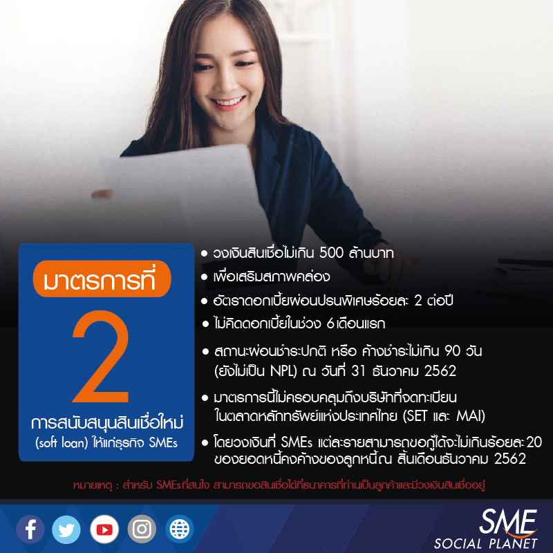 (soft loan) ให้แก่ธุรกิจ SMEs วงเงินสินเชื่อไม่เกิน 500 ล้านบาท เพื่อเสริมสภาพคล่อง