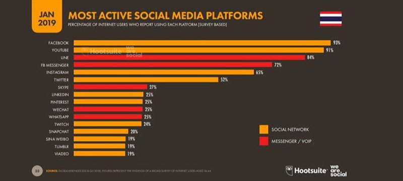ช่องทาง Social Media ที่คนไทยนิยมใช้อันดับ 1 คือ Facebook 93% อันดับ 2-6 คือ Youtube 91%, Line 84%, Messenger 72%, Instagram 65% และ Twitter 52% ตามลำดับ