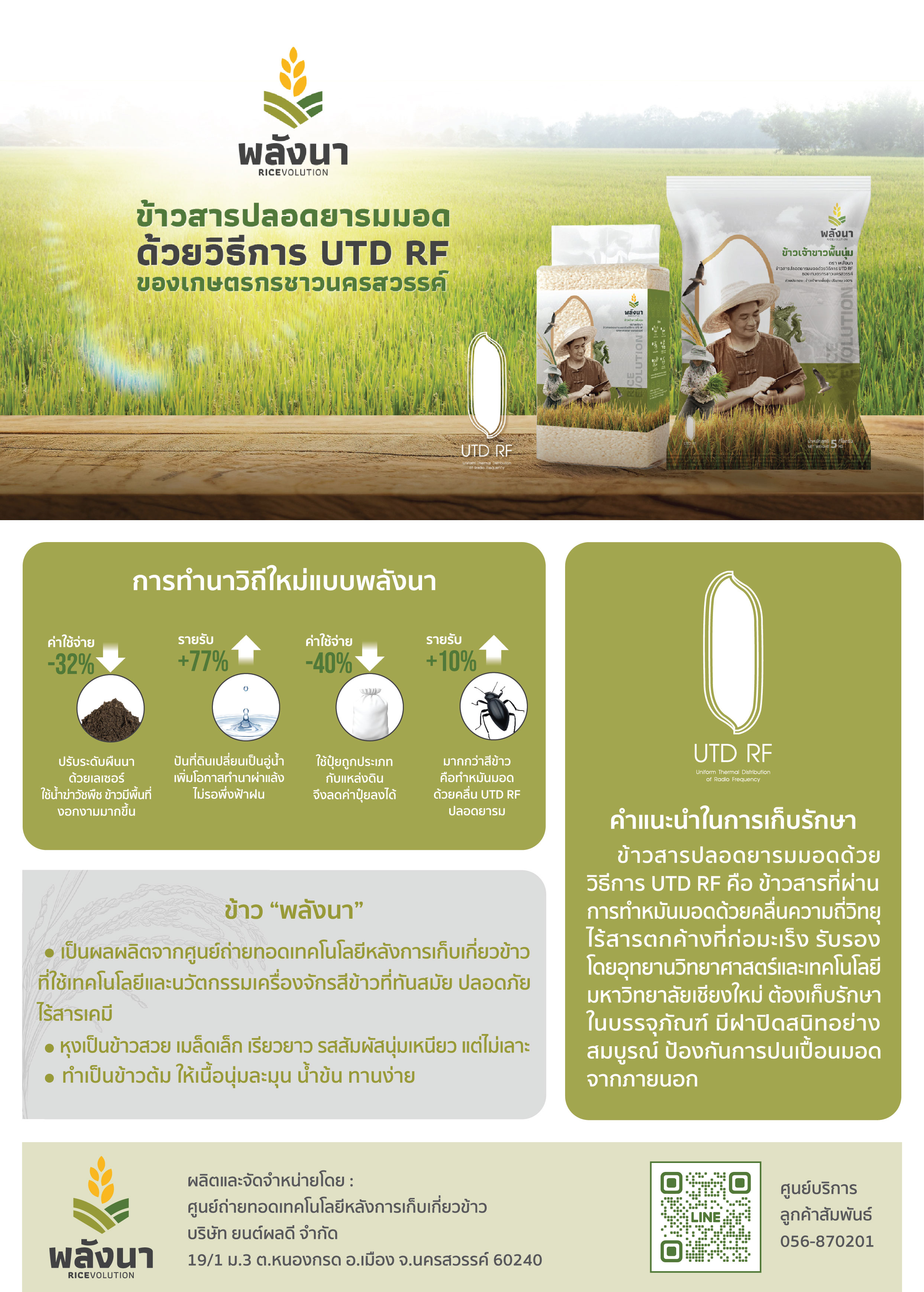 คุณกานต์ บอกว่า ปัจจุบัน ผู้บริโภคส่วนใหญ่อาจไม่ทราบว่าในกระบวนการสีข้าว มีการรมยาและสารเคมีกำจัดแมลงในข้าวหลายครั้ง เพื่อลดความเสียหายและยืดอายุการเก็บรักษาให้นานขึ้น ซึ่งเทคโนโลยี UTD RF จะเข้ามาทดแทนกระบวนการรมยาในข้าว ทำให้ผู้บริโภคมั่นใจได้ว่าข้าวปลอดจากสารเคมีในกระบวนการแปรรูปแบบ 100% โดยข้าวที่ผ่านกระบวนการ UTD RF จะมีราคาสูงขึ้นจากเดิมเพียง 2-3 บาทต่อกิโลกรัมเท่านั้น