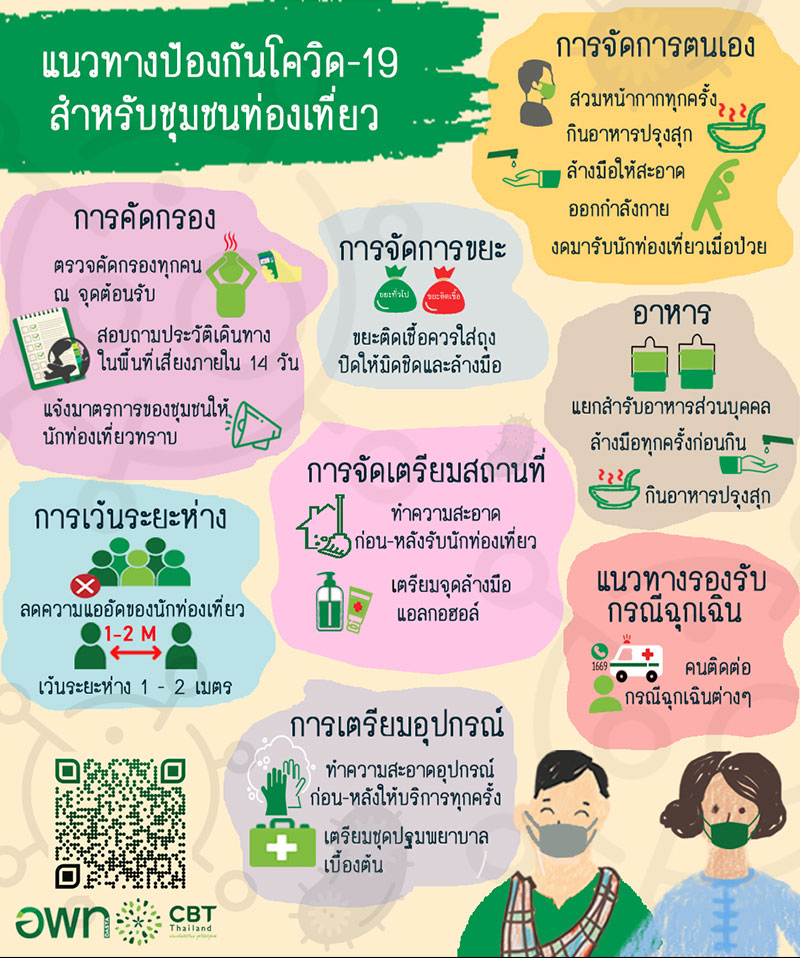 (องค์การมหาชน) หรือ อพท. ก็ตอบรับนโยบายดังกล่าว ด้วยร่วมกับภาคีเครือข่าย จัดทำ “ข้อปฏิบัติของแหล่งท่องเที่ยวโดยชุมชนเพื่อสุขอนามัยปลอดภัยใส่ใจในสุขภาพ” เพื่อเป็นแนวปฏิบัติให้กับชุมชนท่องเที่ยวและผู้มาเยือน