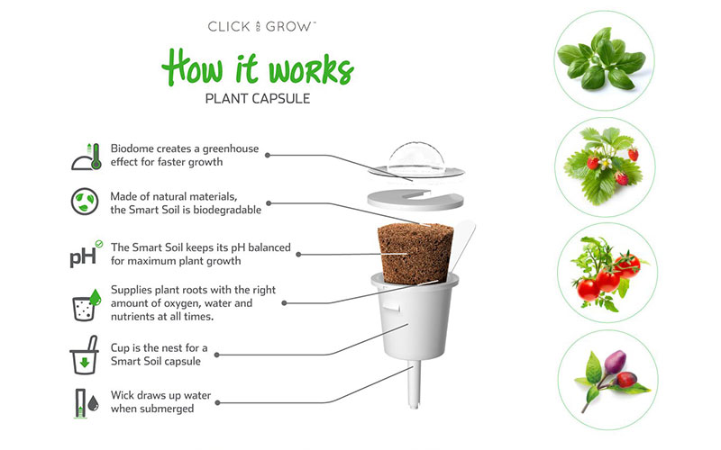 ถ้าเมื่อไหร่ที่เกษตรกรไทยได้เจ้าแคปซูลสุดไฮเทคนี้มาช่วยงานในไทย กลุ่มเกษตรกรได้เตรียมร้องไชโยกันเป็นแถวแน่นอน เมื่อได้พบกับเจ้า Startup ที่มีชื่อว่า Click & grow ที่ได้คิดค้นเจ้าแคปซูลตัวนี้สามารถนำมาใช้ปลูกผักสมุนไพร หรือเพาะเห็ดได้ทุกที่ เพราะมีระบบเซนเซอร์และไฟ LED โดยไม่ต้องใช้แสงอาทิตย์ใดๆ การใช้งานทำได้ง่ายๆ เพียงบรรจุแคปซูลลงในช่องปลูก เติมน้ำลงในถังเก็บน้ำเพียงเดือนละครั้ง และเสียบปลั๊กสำหรับไฟ LED ซึ่งปรับแสงให้เหมาะแก่การเจริญเติบโตของพืชได้อัตโนมัติ โดยดินจะช่วยปรับสภาพแวดล้อมให้เหมาะแก่การเจริญเติบโตของพืช ทั้งสารอาหาร อากาศ และน้ำ ช่วยรักษาค่า pH ที่เหมาะสม เรียกได้ว่าเจ้าแคปซูลสามารถปรับตัวกับสภาพแวดล้อมของแต่ละที่ได้โดยอัตโนมัติ เพื่อเป็นการเปิดโลกอุตสาหกรรมให้ก้าวไกลไปอีกขั้นนั่นเอง