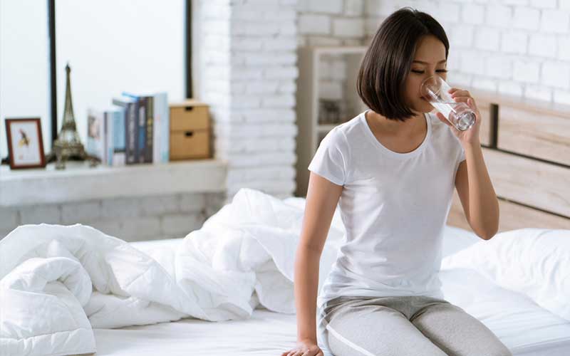 7. ดื่มน้ำ 2 แก้วก่อนนอน : ในช่วงเวลานอนหลับนานถึง 6-8 ชั่วโมง เป็นช่วงที่ร่างกายไม่ได้รับน้ำเลย ดังนั้นคุณควรเตรียมการด้วยการดื่มน้ำก่อนนอนสัก 2 แก้ว คุณอาจไม่จำเป็นต้องดื่มน้ำรวดเดียว 2 แก้วก่อนนอนก็ได้ เพราะนั่นจะทำให้ต้องตื่นขึ้นมากลางดึกเพื่อเข้าห้องน้ำ เป็นการรบกวนเวลานอนหลับอันแสนสบาย คุณอาจวางแผนดื่มน้ำเพื่อทิ้งเวลาก่อนนอน หรืออาจมีน้ำสัก 1 แก้ววางไว้ที่หัวเตียงสำหรับตื่นกลางดึกขึ้นมาแล้วหิวน้ำ
