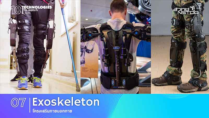 7. โครงเสริมภายนอกกาย (Exoskeleton): คงจะดีไม่น้อย ถ้าคนพิการที่เดินไม่ได้กลับมาเดินได้อีกครั้ง คนดูแลผู้ป่วยตัวเล็ก ๆ สามารถยกเคลื่อนย้ายผู้ป่วยที่น้ำหนักมากที่นอนติดเตียงได้อย่างสบาย ๆ ไม่ปวดหลัง เทคโนโลยีนี้เรียกว่า Exoskeleton หรือโครงเสริมภายนอกกาย เป็นเทคโนโลยีที่ช่วยให้มนุษย์มีพละกำลังเสริม และยังป้องกันอันตรายบางอย่างต่อร่างกายได้ ซึ่งมีการนำ Exoskeleton ใช้ช่วยเพิ่มความสามารถทำภารกิจต่าง ๆ ใช้ในทางทหาร ใช้กู้ภัย ใช้ช่วยเรื่องฝึกฝนและสร้างสมรรถภาพของนักกีฬาได้ และในทางการแพทย์ก็ช่วยเร่งกระบวนการฟื้นฟูสมรรถภาพร่างกายของผู้ป่วย ยกระดับคุณภาพชีวิตคนพิการหรือผู้สูงอายุโดยทั่วไปได้อีกด้วย
