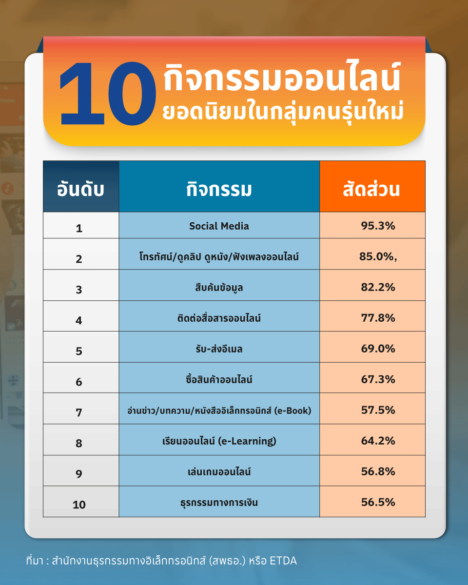 (สพธอ.) หรือ ETDA รายงานผลการสำรวจพฤติกรรมผู้ใช้อินเทอร์เน็ตในประเทศไทยเมื่อปี