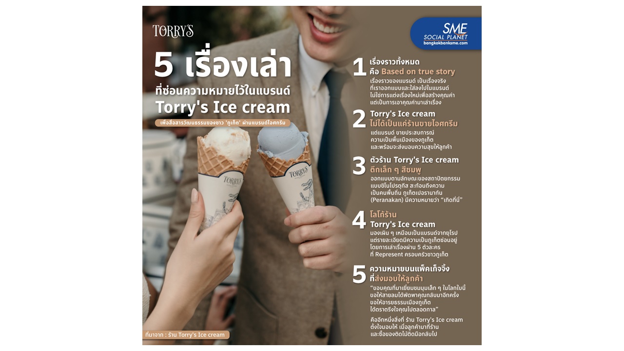 คุณทอรี่ วงศ์วัฒนกิจ ที่ไปเรียนและใช้ชีวิตอยู่ต่างประเทศมานับสิบปี เลือกกลับมาทำธุรกิจร้านไอศกรีม ที่ผสานคุณค่า วัฒนธรรม ความเป็นเอกลักษณ์ สู่เรื่องเล่าผ่านแบรนด์ โดยเขาสอดแทรก Story ลงไปในทุกรายละเอียดขององค์ประกอบอย่างพิถีพิถันและตั้งใจ จนกลายเป็นแบรนด์ Torry's Ice cream ร้านเล็ก ๆ ที่มีเพียง 5 โต๊ะ ในทำเลย่านเมืองเก่า ที่ได้รับความนิยมอย่างมากจากนักท่องเที่ยวและคนท้องถิ่น