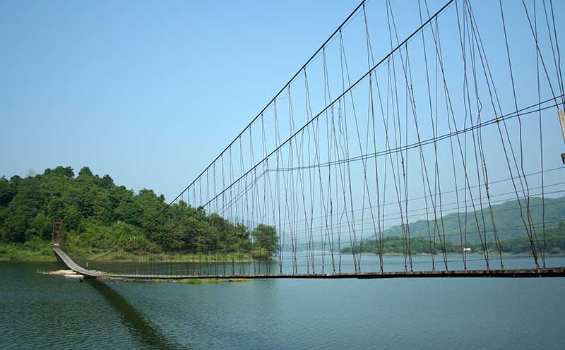 มาเยือนเขื่อนแก่งกระจาน ก็ต้องมาเดินข้ามสะพานแขวนที่เชื่อมระหว่างเกาะเล็กๆในเขื่อน เป็นสะพานไม้โยงด้วยเชือก มีความยาว 500 เมตร เดินให้หวาดเสียวเล่น แต่ถือเป็นจุดถ่ายรูปยอดฮิตที่ทุกคนต้องมาcheck in
