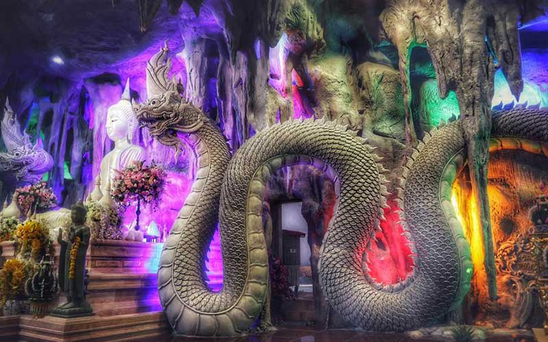 ซึ่งเป็นพระพุทธรูปองค์ขาวขนาดใหญ่ ภายในถ้ำตกแต่งด้วยแสงสีต่างๆ