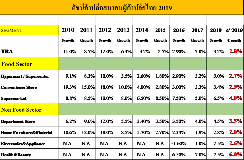 สำหรับปี 2562 ภาพรวมธุรกิจค้าปลีกในประเทศไทย คาดว่าจะขยายตัว 28% ต่ำกว่าปี 2561 ที่ขยายตัว 3.2% มีมูลค่ารวม 3.8 ล้านล้านบาท ยังคงชะลอตัวต่อเนื่อง