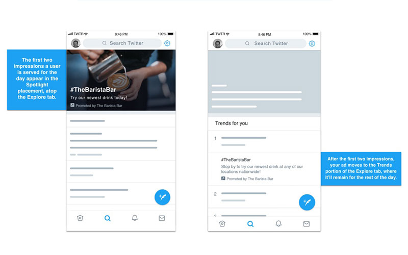 ด้วยตำแหน่งที่โดดเด่นบนแท็บการค้นหา ทำให้ฟีเจอร์โฆษณาแบบ Spotlight ช่วยสร้างความแตกต่างให้กับแบรนด์บนทวิตเตอร์ ด้วยการแสดงผลถัดจากคอนเทนท์ที่กำลังนิยม นอกเหนือจากตำแหน่งไพร์มโลเคชั่นและการครอบคลุมกลุ่มเป้าหมายในวงกว้างแล้ว แบรนด์ยังสามารถเปิดบทสนทนาและเชิญชวนกลุ่มเป้าหมายให้มาร่วมการสนทนาได้อีกด้วย โดยจากข้อมูลภายในของทวิตเตอร์พบว่า คนทั่วไปมักจะคลิกดูโฆษณาแบบ Spotlight มากกว่าโฆษณาแบบ Promoted Trend ถึง 3 เท่า