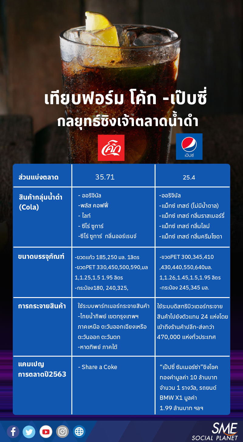 ตลาดน้ำอัดลม ยังคงเป็นตลาดที่มีระดับการขยายตัวสูงแม้ในสถานการณ์ที่กำลังซื้อเปราะบางก็ตาม จะเห็นจากในปี 2562 อัตราการขยายตัวได้ยังสูงถึง 11.7% จากฐานของมูลค่าตลาดรวมที่สูงถึง 56,000 ล้านบาท เป็นอันดับหนึ่งในตลาดเครื่องดื่มปราศจากแอลกอฮอล์ และนี่คือมูลเหตุสำคัญที่ทำให้เกมการช่วงชิงในตลาดน้ำอัดลมไม่เคยจืดชืด แต่ทวีความรุนแรงขึ้นตลอดเวลา โดยโค้กและเป๊บซี่จัดเป็นคู่ Battle ระดับตำนานของตลาด ซึ่งถึงขณะนี้การวางยุทธศาสตร์ของทั้งคู่ยังคงเชือดเฉือนกันเต็มพิกัด มาดูเรื่องนี้เพื่อเป็นกรณีศึกษาสำหรับแนวทางในการกำหนดกลยุทธ์เพื่อเป็นผู้ชนะในเกมการแข่งขันทางธุรกิจ