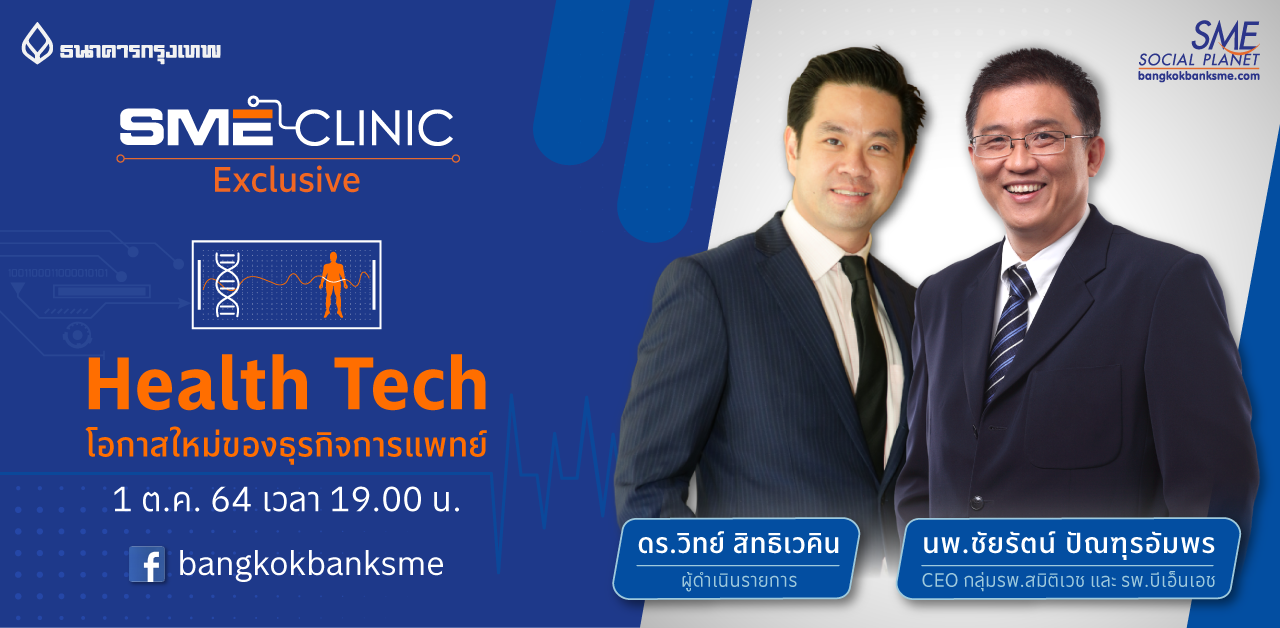 ติดตามชมได้ใน SME Clinic Exclusive ตอน “Health Tech โอกาสใหม่ของธุรกิจการแพทย์” ทาง Facebook : Bangkokbanksme วันศุกร์ที่ 1 ตุลาคม 64 เวลา 19.00 น.