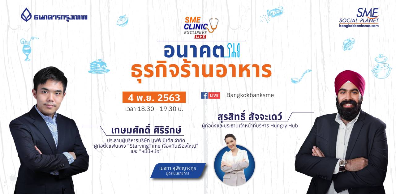 ก้าวอย่างไรให้ทันเทรนด์ พร้อมมองหาโอกาสใหม่เพื่อต่อยอดให้ธุรกิจร้านอาหาร โดย คุณสุรสิทธิ์ สัจจะเดว์ ผู้ก่อตั้งและประธานเจ้าหน้าที่บริหาร Hungry Hub และคุณเกษมศักดิ์ ศิริรักษ์ (ไมเคิล) ประธานผู้บริหารบริษัท มูฟฟ์ มีเดีย จำกัด ผู้ก่อตั้งแฟนเพจ "Starvingtime เรื่องกินเรื่องใหญ่” และ “หมีมีหม้อ” ในรายการ SME Clinic Exclusive วันพุธที่ 4 พ.ย. 2563 เวลา 18.30 - 19.30 น.ทาง Facebook Fanpage : bangkokbanksme