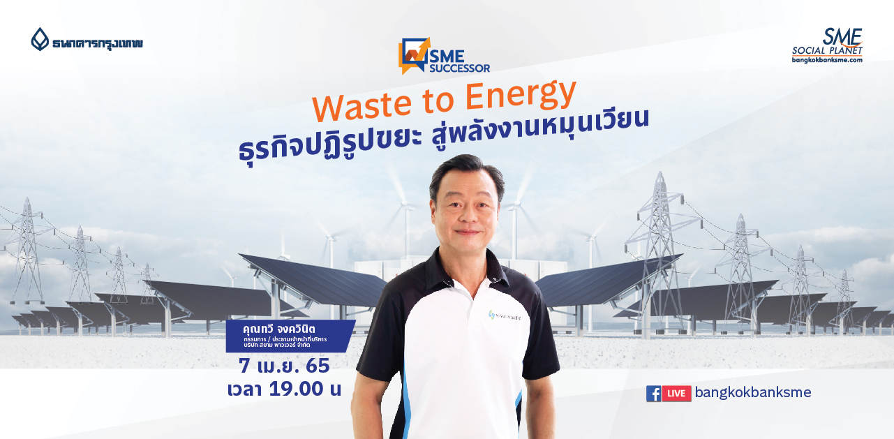 ติดตามกระบวนการและวิธีการแปรรูปจากขยะ สู่พลังงานทดแทนด้วยเทคโนโลยี ระบบเตาเผา (Incineration) ในรายการ SME Successor ตอน Waste to Energy ธุรกิจปฏิวัติขยะสู่พลังงานหมุนเวียน วันที่ 7 เมษายน 2565 ทาง FB: bangkokbanksme