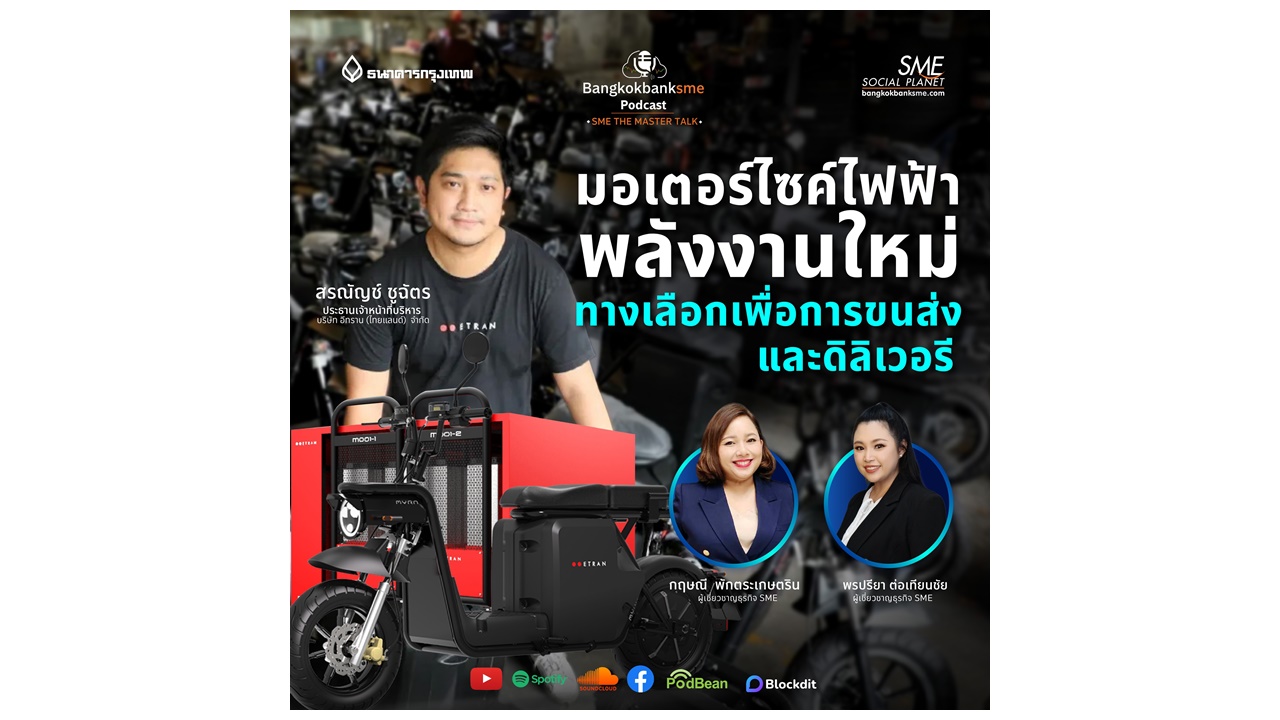 ร่วมพูดคุยถึงโอกาสทางยานยนต์ยุคใหม่ อีทราน “มอเตอร์ไซค์ไฟฟ้า“ กับ คุณสรณัญช์ ชูฉัตร ประธานเจ้าหน้าที่บริหาร บริษัท อีทราน (ไทยแลนด์) จำกัด และ ผู้เชี่ยวชาญด้าน SME ธนาคารกรุงเทพ คุณกฤษณี พักตระเกษตริน และ คุณพรปรียา ต่อเทียนชัย ในรายการ SME The Master Talk ตอน “มอเตอร์ไซค์ไฟฟ้า“ พลังงานใหม่ ทางเลือกเพื่อการขนส่งและดิลิเวอรี ทาง bangkokbanksme