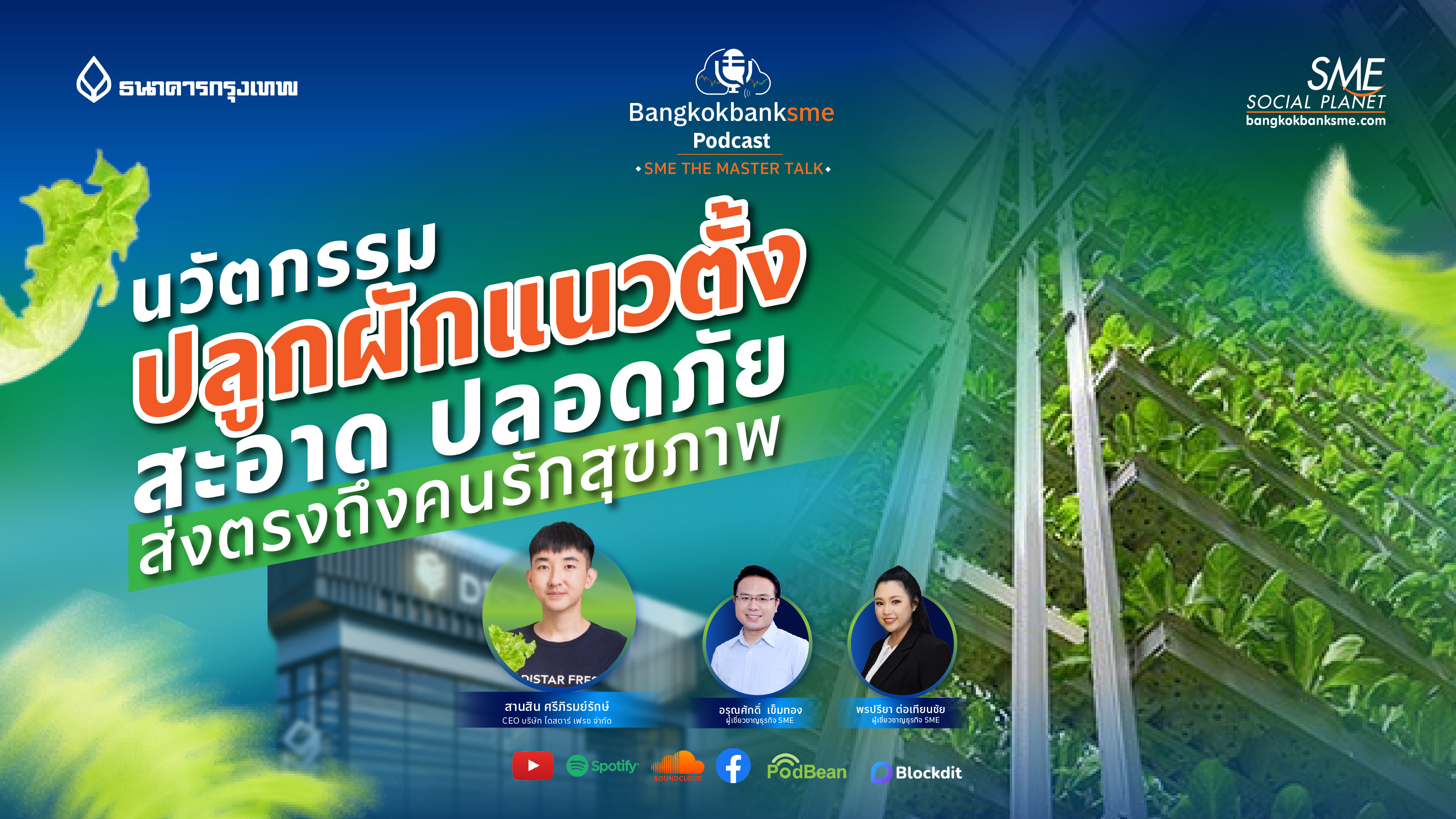 พบกับแนวคิดฟาร์มผักปลอดเชื้อแนวตั้ง จากสตาร์ตอัปเมืองไทย คุณสานสิน ศรีภิรมย์รักษ์ CEO บริษัท ไดสตาร์ เฟรช จำกัด และ 2 ผู้เชี่ยวชาญธุรกิจ SME คุณพรปรียา ต่อเทียนชัย และ คุณอรุณศักดิ์ เข็มทอง ในรายการ SME The Master Talk ตอน นวัตกรรมปลูกผักแนวตั้ง สะอาด ปลอดภัย ส่งตรงถึงคนรักสุขภาพ ทาง bangkokbanksme