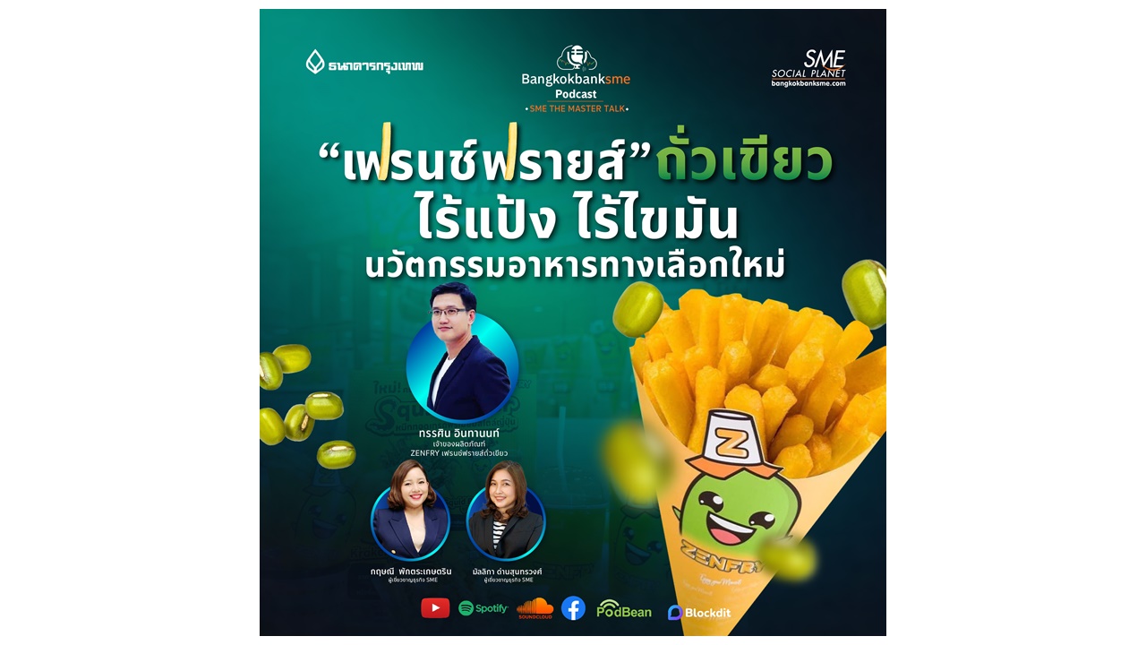 เปิดแนวคิดไอเดียสุดเจ๋งไปกับคุณทรรศิน อินทานนท์ เจ้าของ ZENFRY เฟรนช์ฟรายส์ถั่วเขียว และ ผู้เชี่ยวชาญธุรกิจ SME คุณกฤษณี พักตระเกษตริน และ คุณมัลลิกา ด่านสุนทรวงศ์ ในรายการ SME The Master Talk ตอน “เฟรนช์ฟรายส์” ถั่วเขียว ไร้แป้ง ไร้ไขมัน นวัตกรรมอาหารทางเลือกใหม่ ทาง bangkokbanksme